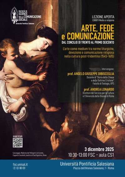 Arte, fede e comunicazione: una lezione aperta per comprendere il linguaggio del sacroLezione aperta del corso Media e religione (CB0811) - Facoltà di Scienze della comunicazione sociale - che mira ad approfondire il contributo delle arti e dei linguaggi visivi nella trasmissione della religione e dell’esperienza del sacro, con particolare attenzione alle dinamiche storico-artistiche e ai loro riflessi nel panorama comunicativo contemporaneo. CS1 - FSC 10:30 |